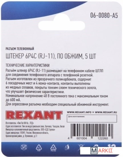 Markit » Кабели, адаптеры, разветвители » Коннектор Rexant 06-0080-A5