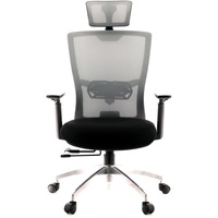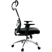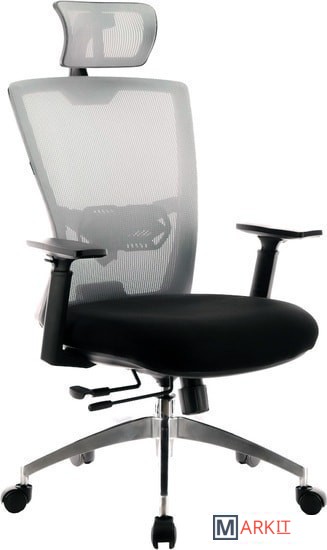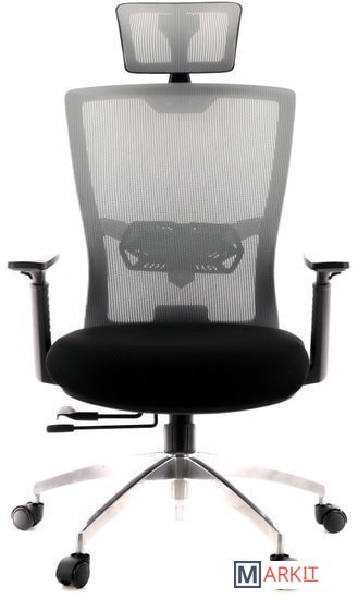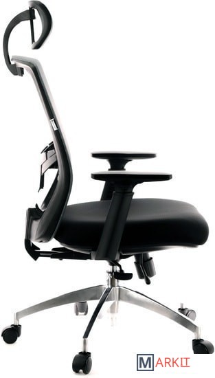 Компактное офисное кресло с подголовником и большим количеством регулировок: регулировка высоты подголовника и его наклона, откидной спинки с фиксацией в разных положениях, регулировка сиденья вперёд-назад с фиксацией в нескольких положениях, регулировка высоты подлокотников, регулировка зоны поддержки поясницы