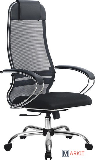 - высокая замкнутая сверху спинка кресла с мягким накладным подголовником;- мягкое объемное сиденье;- черное полимерное покрытие каркаса с хромированным молдингом;- стальные классические подлокотники, покрытые зеркальным хромом;- обивка спинки – сетка натяжная без прошивки (сетка Х2);- обивка сиденья – износостойкая ткань обивочная сетчатая без прошивки.