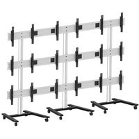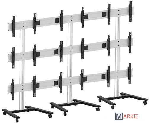 Мобильная стойка для видеостены из 9 дисплеев, расположенных 3 х 3 (3 в ширину, 3 в высоту) с диагональю 30-55" и весом до 40 кг каждый. Поддерживает крепления с VESA 800x400, которые могут регулироваться по высоте на 15 мм и в глубину на 15 мм. Подобная точная настройка позволяет собрать видеостену без зазоров и швов между дисплеев, что бы получить целостное изображение.