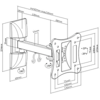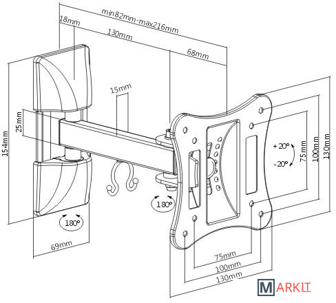 Настенный кронштейн iTECHmount LCD32B с функцией выноса, наклона и поворота рассчитан на телевизоры диагональю от 13” до 27” максимальным весом до 15 кг, позволит надежно закрепить Ваш телевизор на стене Вашего дома или офиса. Данная модель кронштейна имеет 3 степени свободы, позволяет регулировать угол наклона вашего телевизора в диапазоне 20° вверх и 20° вниз, а так же угол поворота экрана до 180°. Вы так же сможете задать необходимый Вам отступ от стены в диапазоне от 82 до 216 мм. Наличие кабель-канала позволит избежать беспорядка из свисающих и спутанных проводов, которые подключаются к телевизору.