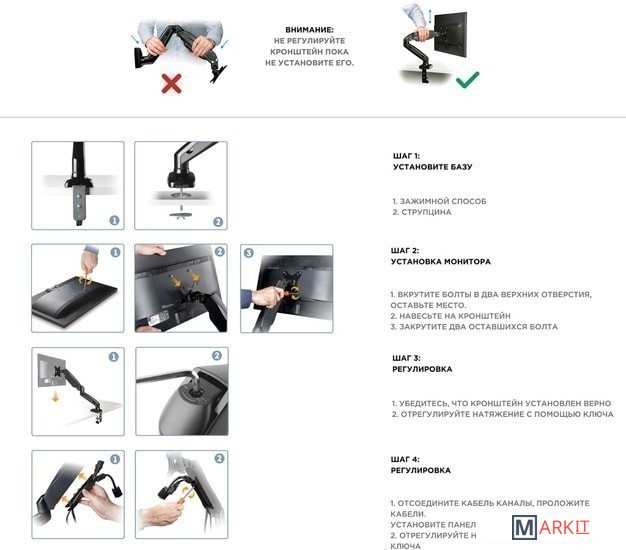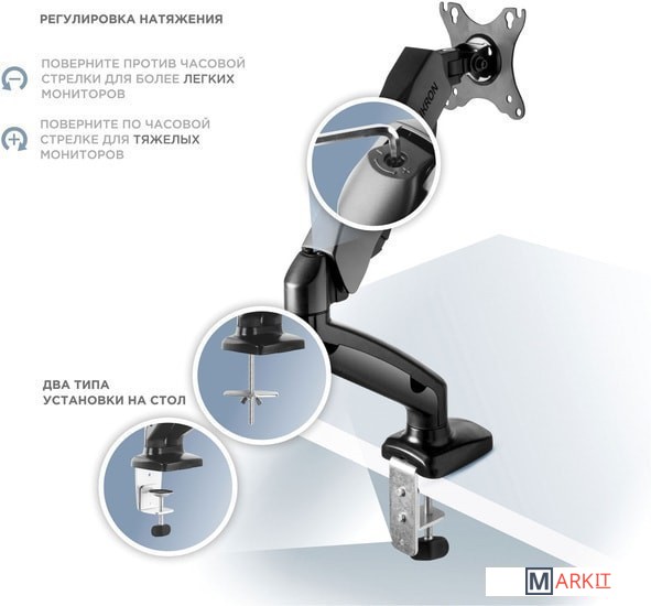 | Функциональные особенности | поворотный, с регулировкой высоты, кабель-канал, струбцинное крепление |