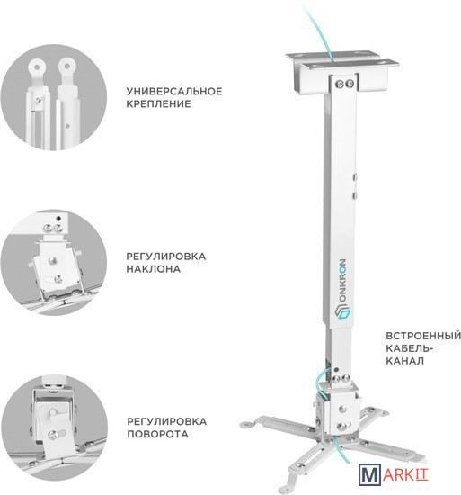 Кронштейн KRON K1A подходит для большинства проекторов, весом до 10 кг. Конструктивно данный кронштейн для проектора является потолочным с изменяемым расстоянием от потолка от 430 до 630мм, что позволяет настроить необходимое расстояние уже после подвешивания.