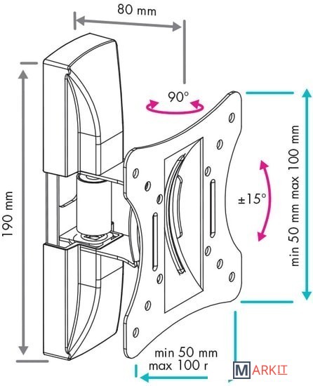 | Угол поворота (без ТВ) | 90 ° |