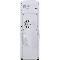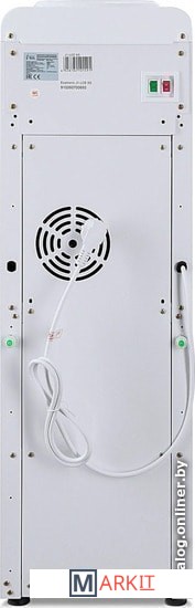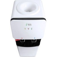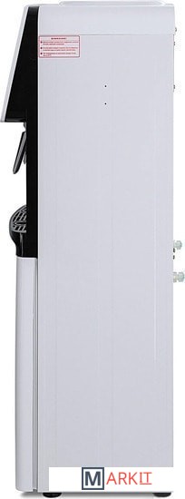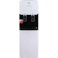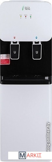 Компактный кулер для воды с функциями нагрева и охлаждения. С небольшим шкафчиком в нижней части. Электронное охлаждение. Корпус белого цвета с черной вставкой в области кранов подачи воды. Индикация режимов нагрева, охлаждения и готовности воды. Краны «нажим кружкой».