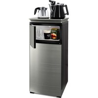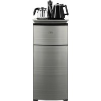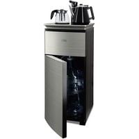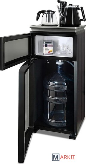 Напольный кулер с чайным столиком. Нижняя загрузка бутыли. Без охлаждения, только нагрев. Нагрев воды в чайнике до 100°С. Два чайника – для кипячения (изотермический) и заварочный. Шкафчик для хранения.Простой, но многофункциональный тиабар:Функция энергосбережения – время работы регулируется от 1 часа до 24 часов.Функция регулировки температуры воды в чайнике позволяет задавать нужную температуру воды в диапазоне от 40°С до 100°С.Функция регулировки времени подачи воды в чайник – возможность задать время подачи воды в чайник (от 18 до 50 сек).На чайном столике расположен кран подачи воды и два чайника, для кипячения и заварочный. Заварочному чайнику можно включить режим постоянного подогрева (~ до 60°С). Чайник кипячения изотермический – меньше греется, лучше сохраняет температуру. Подача воды в него возможна без открытия крышки. Нагрев воды в чайнике включается вручную, либо автоматически в случае использования функции регулировки температуры воды Автоотключение нагрева при температуре 100°С.Панель управления сенсорная, на русском языке, с информационным дисплеем.В верхней части корпуса есть шкафчик для хранения продуктов. Корпус черного цвета, передняя панель – стеклянная, серебристый металлик. Поверхность чайного столика черная с серебристым бортом, чайник для кипячения и кран подачи воды черного цвета с серебристой отделкой.