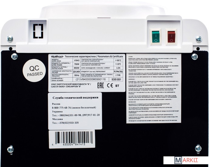Модель напольного диспенсера для воды HotFrost V840 - это аппарат с поистине эксклюзивным дизайном. HotFrost V840 - оптимальное решение для помещений с ограниченным пространством. Слим-дизайн (slim design) позволит разместить его на участке площдью всего 0.085 м².Материалы, из которых он изготовлен кулер, не заставят Вас сомневаться в их качестве. Боковые элементы корпуса кулера выполнены из металла.Черная глянцевая лицевая панель выгодно контрастирует с основным снежно-белым цветом диспенсера. На этой панели находятся индикаторы-светодиоды, которые будут всегда держать вас в курсе происходящего с аппаратом: нагревает ли он воду, происходит ли охлаждение. Яркие огоньки светодиодов видны как в полной темноте, так и при ярком солнечном свете.Для наполнения кружки водой нужно лишь минимальное усилие - удобная для пользователя система «push» интуитивно понятна даже для человека, который раньше никогда не сталкивался с подобным устройством. Температура воды в баках кулера — от 5 до 95 °С.HotFrost V840 - это полнофункциональное устройство с компрессорным типом охлаждения. Компрессорное охлаждение - это синоним высокой производительности и быстрой работы кулера. Абсолютно не важно, какая температура внутри помещения - ваш диспенсер всегда будет работать с полной отдачей.Главное отличие данной конкретной модели от подобных кулеров – это увеличенная мощность нагрева. С этой особенностью кулер стал гораздо производительнее - теперь он способен нагревать вплоть до шести литров воды ежечасно! HotFrost V840 обеспечит вас горячим чаем или кофе в любой момент времени и в любых объемах.