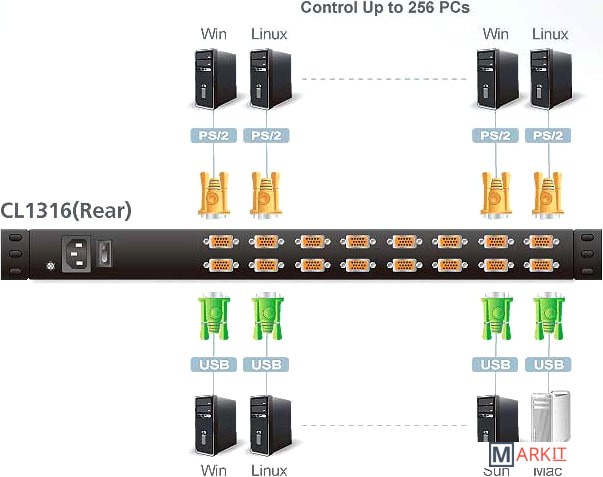 Основные особенности:- с одной консоли можно управлять 16 компьютерами- при 2-х уровневом каскадировании - управление 256 компьютерами- KVM консоль интегрирована с 19-дюймовой LCD панелью- двойной интерфейс подключения — поддерживает компьютеры и консоли с PS/2 и USB соединением- многоплатформенная поддержка - Windows 2000/XP/Vista, Linux, Mac и Sun- поддерживает USB клавиатуры для PC, Mac и Sun- автоматическое определение PS/2 и USB интерфейсов- эмуляция USB / PS/2 клавиатуры и мыши – загрузка компьютеров происходит даже при отсутствии консоли- качество видео до 1280x1024/75 Гц- поддержка DDC2B- выбор компьютеров с помощью кнопок на передней панели, горячих клавиши или многоязычное On-Screen Display (OSD) меню- двухуровневая защита паролями — только зарегистрированные пользователи отслеживают и управляют компьютерами; отдельные профили для каждого из четырех пользователей и администратора- режим автосканирования для мониторинга выбранных пользователем компьютеров- горячее подключение – подсоединение и отсоединение компьютеров без выключения питания переключателя- включение/отключение устройства звукового оповещения с помощью горячих клавиш и OSD-меню- режим широковещательного ввода – команды с клавиатуры могут пересылаться на все доступные компьютеры- устанавливается в телекоммуникационную 19” стойку ( занимает 1U)- локальная LED подсветка, обеспечивающая освещение клавиатурыКомплект поставки:1 х LCD KVM переключатель со стандартным набором для монтажа1 х кабель для обновления встроенного программного обеспечения2 х KVM кабеля1 х шнур питания1 х руководство пользователя