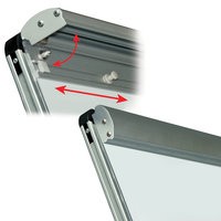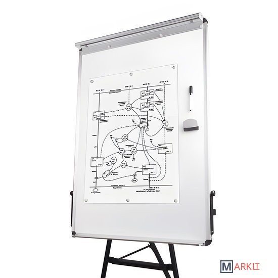 Белое лаковое покрытие предназначено для письма специальными маркерами для белой доски. Размер доски – 100х70 см. Регулируется по высоте до 185 см. Устанавливается на треноге. Металлическая поверхность позволяет размещать объявления при помощи магнитов. Блокнот крепится при помощи неподвижных винтов. Идет в комплекте с лотком для аксессуаров, маркером, стирателем и 4 магнитами. Для защиты рабочей поверхности доски на нее нанесена защитная пленка. Перед началом работы необходимо удалить защитную пленку.