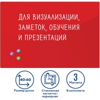 Стеклянная магнитно-маркерная доска BRAUBERG — это современная альтернатива обычным магнитно-маркерным доскам. Позволяет писать маркерами и прикреплять листы.Рабочая поверхность красного цвета изготовлена из небьющегося стекла. Размер доски — 40х60 см. Надежно упакована в защитную пленку и красочную подарочную коробку с ручкой. 3 специальных неодимовых магнита и элементы крепления входят в комплект. Скрытый тип крепления с задней стороны поможет вписать доску в любой интерьер.