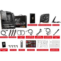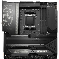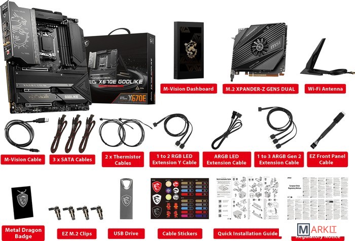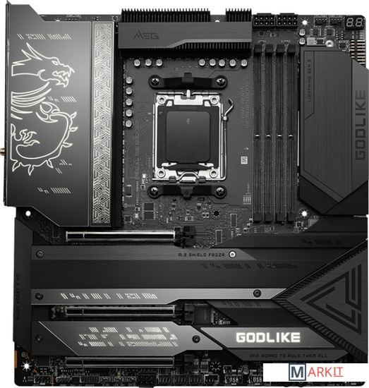 Оригинальный дизайн, новейшие технологии, скоростные интерфейсы и высочайшая производительность – материнская плата MEG X670E GODLIKE предлагает пользователю все возможности чипсета AMD X670. В ее внешнем виде выделяется большой черный радиатор с резным узором и золотистой подсветкой. Изюминкой модели является приборная панель M-Vision, которая служит для мониторинга и управления параметрами компьютера.Оригинальное крепление позволяет установить накопитель в слот M.2 и снабдить его радиатором Shield Frozr без использования винтов.Пластины радиатора Wavy Fin с 7Вт/(м·K) термопрокладкойАлюминиевый радиаторДвухсторонние радиаторы M.2 Shield FrozrТеплорассеиватель для транзисторовПерекрещивающиеся тепловые трубки с прямым контактомУвеличенный чипсетный радиаторПоддержка десктопных процессоров AMD Ryzen™ 7000 серийПоддержка памяти DDR5Приборная панель M-Vision: полноцветный 4,5-дюймовый IPS-дисплей, который не только показывает данные аппаратного мониторинга и предлагает диагностические функции, но и позволяет управлять параметрами ПК с помощью сенсорного интерфейса.Мощная система питания: 24+2+1 фаза питания, 105-амперные силовые модули, два процессорных разъема питания.Эффективное охлаждение: волнистая форма радиаторных ребер, перекрестная тепловая трубка с прямым контактом, теплорассеиватель для транзисторов, термопрокладки с теплопроводностью 7 Вт/(м·K), двухсторонние радиаторы M.2 Shield Frozr и программное обеспечение Frozr AI.Шесть слотов M.2 с радиаторами Shield Frozr: четыре встроенных и два – через эксклюзивный PCIe-адаптер M.2 XPANDER-Z GEN5 DUAL.Новейшие сетевые стандарты: встроенные контроллеры 10G Ethernet, 2.5G Ethernet (Intel), Wi-Fi 6E.Высокоскоростные интерфейсы: слоты PCIe 5.0 и M.2 (PCIe 5.0 x4), фронтальный USB 3.2 Gen2x2 20 Гбит/с с 60 Вт USB PD.Для энтузиастов: магнитное и безвинтовое крепление радиаторов M.2 Shield Frozr, защелки EZ M.2, «умная» кнопка, предустановленная интерфейсная панель, технология Steel Armor.10-слойная печатная плата стандарта 2oz, с увеличенным содержанием меди: обеспечивает повышенную стабильность работы компьютера в долгосрочной перспективе..Аудиосистема Audio Boost 5 HD: новейший аудиопроцессор ALC4082, цифроаналоговый преобразователь с усилителем ESS.