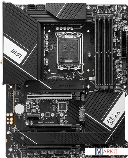 Модель PRO Z790-A WIFI – это широкая функциональность в сочетании с WIFI и поддержкой памяти DDR5.Серия PRO – это оборудование для профессионалов, работающих в самых разных сферах. Такие устройства отличаются высоким качеством изготовления, великолепной производительностью и удобством использования. Выбирайте PRO-серию MSI, чтобы работать продуктивнее и эффективнее!Увеличенный радиаторБлагодаря увеличенному радиатору увеличивается общая площадь теплорассеяния, что способствует эффективному охлаждению под высокими нагрузками.Радиатор M.2 Shield FrozrПредотвращает перегрев и последующее падение производительности твердотельного накопителя в слоте M.2, а также защищают подключенное устройство от физических воздействий.Массивный радиатор системы питанияРассеивает тепло, выделяемое МОП-транзисторами в верхней части платы.Эффективные термопрокладкиНа транзисторах системы питания имеются термопрокладки с теплопроводностью в 7Вт/(м·K). Доп. термопрокладками снабжены катушки, что гарантирует стабильную работу компьютера под высокими нагрузками.Увеличенный чипсетный радиаторОтсутствие вентилятора помогает избавиться от пыли и шума, а чтобы чипсет не перегревался, его радиатор был значительно увеличен в размере.Материнские платы MSI позволяют регулировать все подключенные к ним системные и процессорные вентиляторы, выдавая пользователю всю необходимую для этого информацию в лаконичном визуальном формате как в BIOS, так и в Windows. Чтобы скорость вращения изменялась автоматически, достаточно указать 4 пороговых значения температуры.Поддерживаются процессоры 12-/ 13-го поколения Intel® Core™, Pentium® Gold и Celeron® для сокета LGA 1700Поддерживается память DDR5, до 7200+(OC) МГцМощная система питания: Duet Rail по схеме 16+1+1 фаз с модулями 80A SPS, два 8-конт. процессорных разъема питания, Core Boost, Memory BoostЭффективное охлаждение: увеличенный радиатор, термопрокладки 7 Вт/(м·K) на элементах питания, дополнительные катушки с термопрокладками и технология M.2 Shield Frozr для производительной работы нон-стопВысококачественная конструкция: 6-слойная печатная плата, изготовленная по серверным стандартам, с увеличенным содержанием медиВысокоскоростные интерфейсы: слоты PCIe 5.0, Lightning Gen 4 x4 M.2, USB 3.2 Gen 2x2Интерфейс Intel Turbo USB 3.2 Gen2: USB-контроллер Intel обеспечивает стабильно высокую скорость передачи данных2.5G Ethernet с Wi-Fi 6E: высокоскоростное и стабильное проводное и беспроводное сетевое подключение для широкого спектра приложенийАудиосистема AUDIO BOOST 5: высококачественное звучание, создающее неповторимую атмосферу в играх