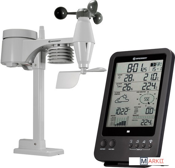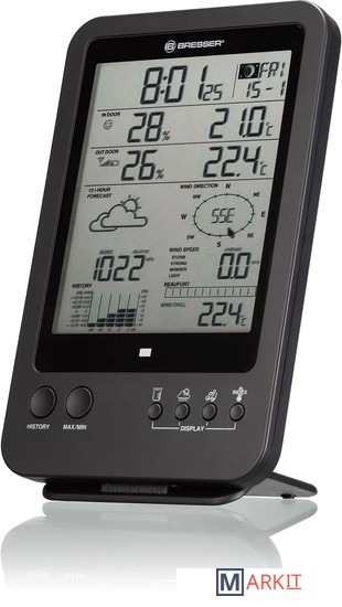 Многофункциональная метеостанция Bresser «5 в 1» – выбор тех, кто хочет следить за всеми изменениями погоды за окном и микроклимата дома. Она проводит измерения внутри и снаружи помещения, показывает текущую информацию, составляет графики изменений за последние сутки и прогноз погоды на ближайшие 12 часов. Вся информация выводится на встроенный экран метеостанции в структурированной и наглядной форме.В верхней половине экрана можно увидеть время, день недели, дату, фазу Луны, а также температуру и влажность в помещении и на улице. Рядом показывается иконка общего уровня комфорта. В нижней половине экрана расположены изображение прогноза погоды, график изменения атмосферного давления, шкала индекса Бофорта, сведения о направлении и скорости ветра, уровень выпавших осадков. Также метеостанция определяет точку росы и тепловой индекс. Под экраном находятся основные кнопки управления. Еще часть кнопок вынесена на заднюю крышку.Метеостанция дополнена беспроводным наружным датчиком, связь с которым прибор может поддерживать на расстоянии до 30 метров. Для питания основного модуля и датчика используются батарейки, т. е. нет необходимости прокладывать по квартире провода. Метеостанцию можно ставить на полку или вешать на стену (крепеж включен в комплектацию).