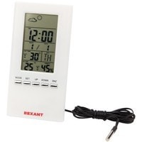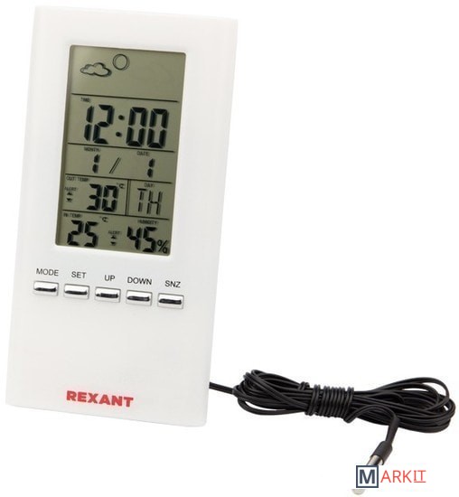 Комнатно-уличная метеостанция REXANT предназначена для измерения показаний температуры в помещении и на улице, комнатной влажности, имеет часы, календарь, функцию будильника и прогноза погоды.Регистрирует в памяти максимальное и минимальное значения температур.Отображает общий уровень метеокомфорта в помещении.