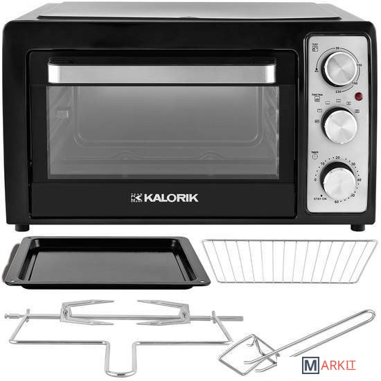 Электрическая мини-печь KALORIK с конвекцией, грилем и вертелом точно пригодится на вашей кухне!Многофункциональный выбор режима приготовления (нагрев вниз / вверх / вверх и вниз, горячий воздух, вертел и горячий воздух)Двойное остекление в двериРегулировка температуры: 90-250°С .Функция горячего воздухаБарбекю60-минутный таймерЗвуковой сигнал окончания приготовленияНагревательный элемент из нержавеющей сталиВ комплекте с противнем, решеткой для гриля , вертелом и ручкой .Внутри: ширина: 33,5 смвысота: 19 см между нагревателями, всего 24,5 смглубина: 31 см