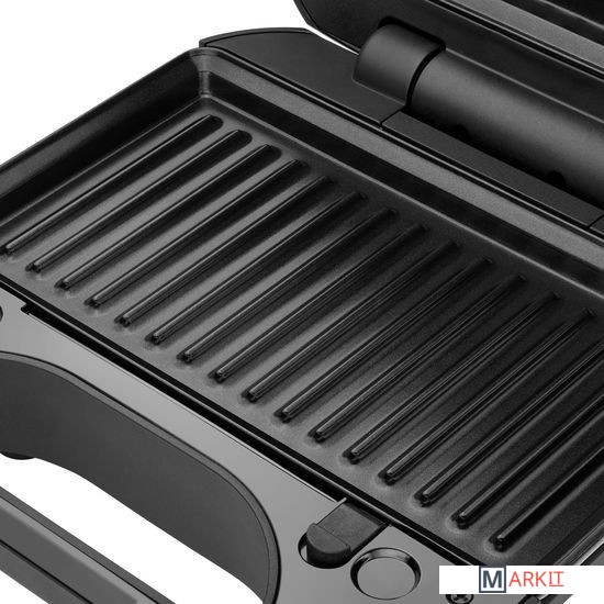 В комплекте есть три съемные пластины с антипригарным покрытием: для приготовления сэндвичей, гриля и вафель.