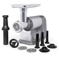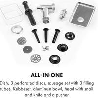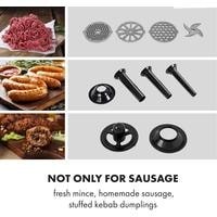 большая емкость для наполнения из алюминиязакругленные края внутри для легкой очисткиреверсивная передача для удаления остатков мяса и тестанабор для начинки колбас с тремя насадками для мясника для мелкой, средней и крупной колбасной массыпластиковый толкательавтоматический выключатель в случае перегрева / перегрузкинескользящие резиновые прокладки для надежного положенияпитание: 220-240 В ~ | 50/60 Гц