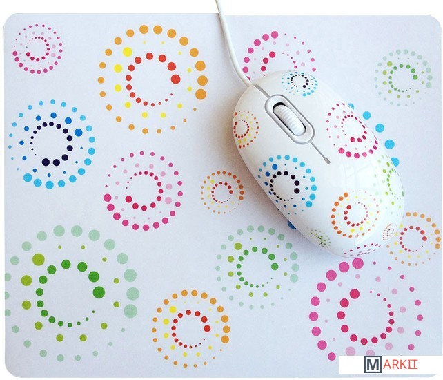 Яркий комплект компьютерной мыши и коврика. Манипулятор подходит для работы как правой, так и левой рукой.