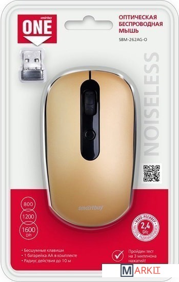 SmartBuy ONE 262 - оптическая беспроводная мышь со сменным разрешением и бесшумными кнопками. Модель выполнена в симметричном дизайне и имеет компактные размеры. Чувствительный оптический датчик обеспечивает точное позиционирование курсора и работает практически на любых поверхностях. С помощью отдельной кнопки можно быстро переключить разрешение сенсора, которое изменяется в пределах 800-1200-1600 dpi. Беспроводная частота 2.4 ГГц гарантирует стабильную передачу сигнала на расстоянии до 10 метров. Источником питания служат одна батарейка размера AA, входящая в комплект поставки. Технология энергосбережения автоматически отключит мышь при неиспользовании. Миниатюрный приемник можно хранить в специальном отсеке в корпусе мыши или оставлять подключенным к компьютеру.
