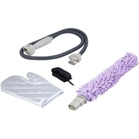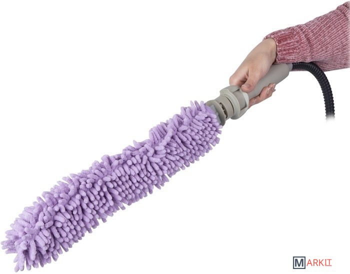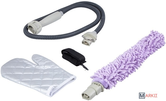 | Комплектация | 1. Съемный чехол из микрофибры с клиновидными волокнами.2. Гибкая насадка-распылитель.3. Гибкий шланг-удлинитель.4. Термоустойчивая защитная рукавица.5. Ремень для переноски отпаривателя/пароочистителя. |