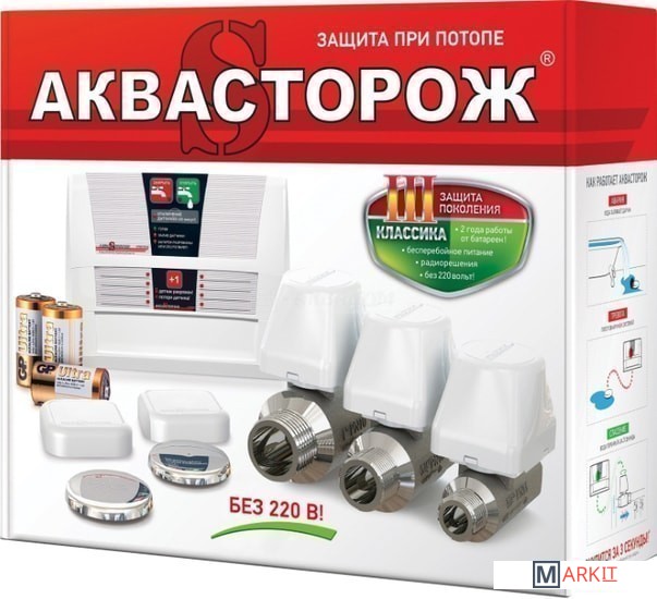 Электронно-механическая система "Аквасторож" предназначена для информирования пользователя о протечке воды и минимизации последствий аварии в системе водоснабжения. "Аквасторож" автоматически перекрывает воду при обнаружении затопления. Работает полностью автономно.В обновленной версии «Классики» добавилась функция контроля состояния крана. В случае если что-то попало в кран, и он не закрылся до конца, Система проинформирует об этом пользователя.Состав комплекта:- контроллер Классика (блок управления);- шаровые электрокраны Классика 1/2" (15 мм);- проводные датчики протечки;- провода (2м и 4м);- батареи R14 (тип C) 3 шт.;- настенный крепеж.Контроллер Классика может работать только с кранами версии "Классика". Поддерживает до 6 кранов 1/2" (15 мм), или до 6 кранов 3/4" (20 мм), и до 3 кранов 1" (25 мм).