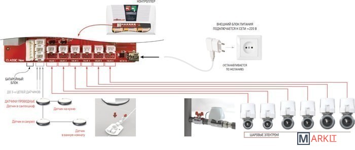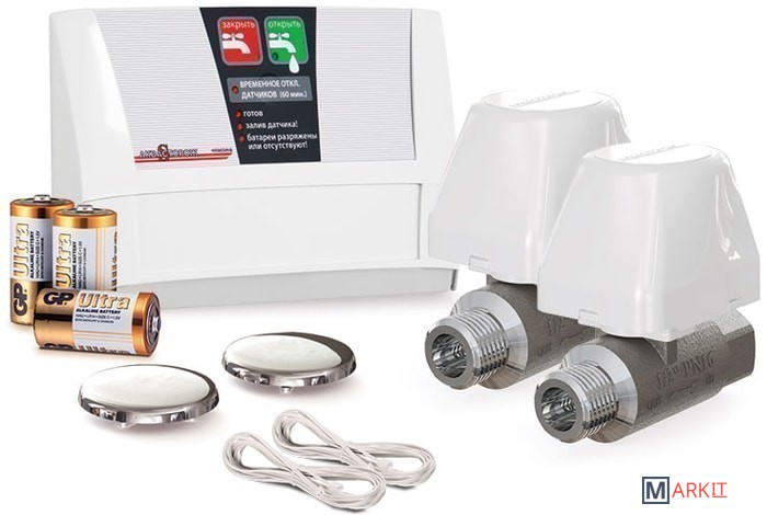 | Комплектация | 2 крана 1/2‘’ (ДУ 15мм), контроллер Классика, 2 проводных датчика Классика (провода 2м, 4м), батареи R14 (тип “C”) 3шт, крепеж. |