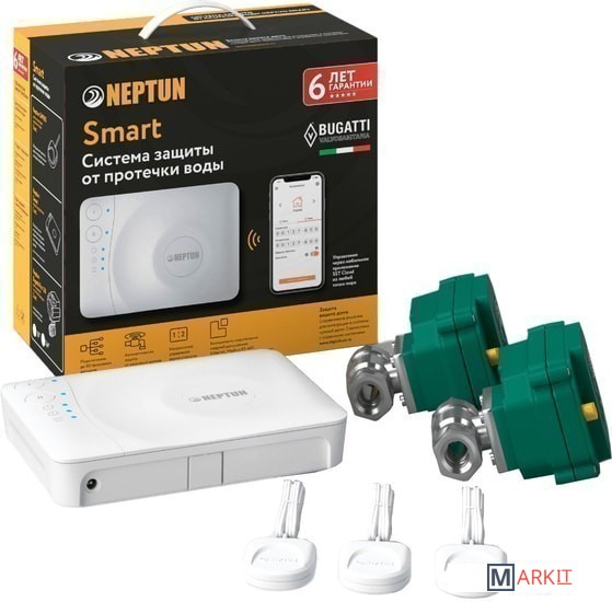 • Модуль управления Neptun Smart – 1 шт.• Датчик Нептун SW 005 – 3 шт• Кран шаровый с электроприводом Neptun Bugatti Pro 12В 3/4″- 2 шт.• Блок питания 12В – 1 шт.