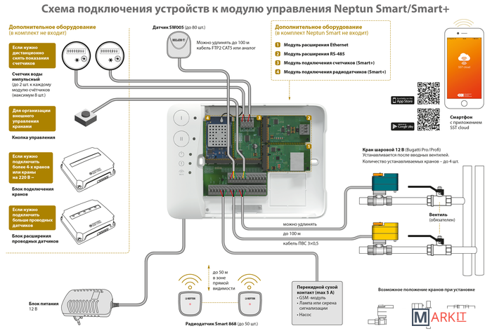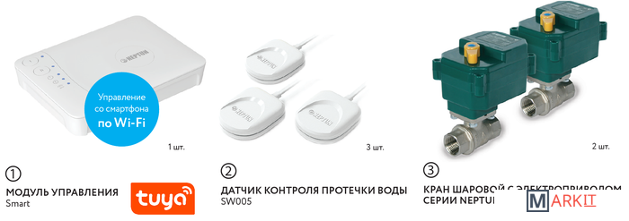 Умная система защиты от протечки воды Neptun BUGATTI Smart Tuya предназначена для обнаружения и локализации протечек воды в системах водоснабжения. Компоненты системы связаны и взаимодействуют друг с другом через центральный контроллер (модуль управления Neptun Smart), который может быть дополнительно укомплектован дополнительными платами расширения:• RS-485 (для систем диспетчеризации)• Ethernet (для проводного подключения в случае невозможности организации подключения к Wi-Fi)• Счетчики воды (для контроля показаний расхода воды с приборов учета ГВС и ХВС)• Радиодатчики (для организации соединения с датчиками Neptun Smart 868)Контроль протечки воды осуществляется автоматически, не требует участия пользователя, а также позволяет проводить мониторинг системы с помощью приложения Tuya Smart.Функции:• Контроль протечки воды• Автоматическая блокировка водоснабжения при срабатывании любого датчика• Звуковая и световая сигнализация об аварии• Запоминание состояния аварии до устранения ее последствий• Защита шарового крана от закисания (Автоматический проворот крана один или два раза в месяц)• Отправка push-уведомлений о состоянии системы на смартфон• Мониторинг приборов учета расхода воды (счетчиков)• Удаленное управление подачей воды при помощи смартфона