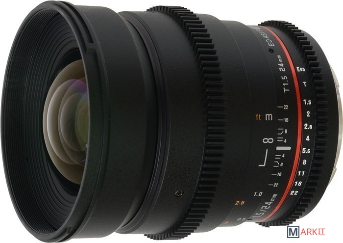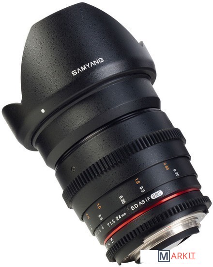 Широкоугольный объектив с ручной фокусировкой Samyang 24 mm T 1,5 ED AS UMC VDSLR предназначен для полноразмерных цифровых фотоаппаратов. Сделан специально для использования с механизмами видеосъёмки цифровыми зеркальными фотоаппаратами. На корпусе объектива нанесена шкала дистанции и диафрагмы с поворотом на 90 градусов. Фокусировочное кольцо и кольцо диафрагмы имеет специальную зубчатую передачу и плавный ход. Объектив выполнен в надежном и качественном корпусе из металла и пластика с металлическим байонетом.