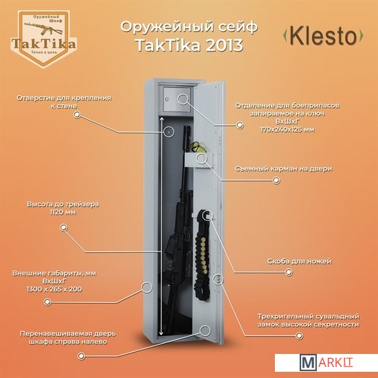 Металлический оружейный шкаф TakTika 2013 оснащен двумя надежными сувальдными замками повышенной секретности с тремя ригелями. Сейф позволяет хранить до двух ружей. Сейф имеет запираемый на ключ встроенный ящик под патроны, съемный карман для аксессуаров, а также скобу для инвентаря. Предусмотрены отверстия для крепления к полу и стене. Мягкий коврик позволит аккуратно и бережно устанавливать ружье без риска повредить приклад. Дверь усилена металлическим коробом, который не только закрывает замки, но и обеспечивает дополнительную жесткость конструкции, а так же позволяет перевешивать дверь справа налево. Максимальная длина оружия, размещаемого в сейфе -1120 мм. Шкаф покрашен износостойкой порошковой краской.