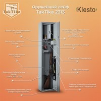 Металлический оружейный шкаф TakTika 2313 оснащен двумя надежными сувальдными замками повышенной секретности с тремя ригелями. Сейф позволяет хранить до двух ружей с дополнительными аксессуарами и имеет запираемый на ключ встроенный ящик под патроны, съемный карман для аксессуаров, сварную полку, а также скобу для инвентаря. Предусмотрены отверстия для крепления к полу и стене. Шкаф укомплектован съемными резиновыми держателями, что позволяет крепко зафиксировать ствол ружья исключая смещение оружия внутри шкафа. Мягкий коврик позволит аккуратно и бережно устанавливать ружье без риска повредить приклад. Дверь усилена металлическим коробом, который не только закрывает замки, но и обеспечивает дополнительную жесткость конструкции, а так же позволяет перевешивать дверь справа налево. Максимальная длина оружия, размещаемого в сейфе -1295 мм. Высота от пола до трейзера - 800 мм. Шкаф покрашен износостойкой порошковой краской.