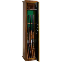 GRIFONE 1503331 — классический оружейный сейф с окраской под дерево. Предназначен для надёжного и комфортного хранения 5 ружей. Сертифицирован на взломостойкость в соответствии с европейским стандартом EN 14450 — класс S1. Корпус и дверь имеют двухслойную стальную конструкцию, изготовлены из стали толщиной 3 мм. Дверь усилена по периметру ребрами жесткости, по всей высоте — противоотрывной шарнир. Трехсторонняя ригельная система запирания — ригели из никелированной стали диаметром 22 мм. Комплектуется сейфовым (класс А, EN1300) ключевым замком, защищенным от высверливания. Ключ нельзя вытащить при незапертом замке, что удобно и безопасно — дверь не останется случайно открытой. Внутри — запираемое патронное отделение и ложементы на пять ружей, выполненные из высокоплотного пеноматериала. Внутренняя отделка — мокет (обивочный бархат). Снаружи сейф оклеен высокоустойчивой к потертостям и царапинам термопленкой, имитирующей дерево (орех, клен). Конструкция предусматривает возможность анкерного крепления сейфа к стене или полу.
