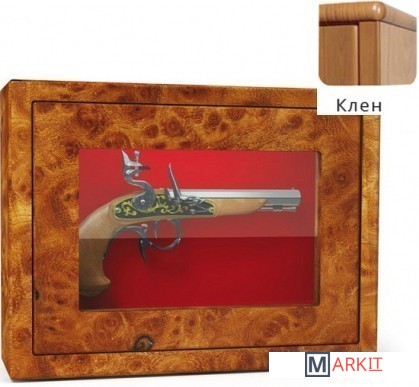 Оружейный взломостойкий сейф с боковыми стенками и застекленной дверью. Многослойное пуленепробиваемое стекло, толщина которого 22 мм, трехсторонняя ригельная система с ручным приводом. Внутренняя отделка — зеленый мокет. Предусмотрено крепление к стене и к полу.