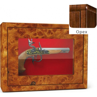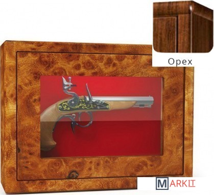 Оружейный взломостойкий сейф с боковыми стенками и застекленной дверью. Многослойное пуленепробиваемое стекло, толщина которого 22 мм, трехсторонняя ригельная система с ручным приводом. Внутренняя отделка — зеленый мокет. Предусмотрено крепление к стене и к полу.