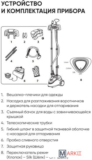 | Дополнительные насадки и приспособления | - насадка для разглаживания воротничков и держатель насадки для отпаривания;- защитная рукавица. |