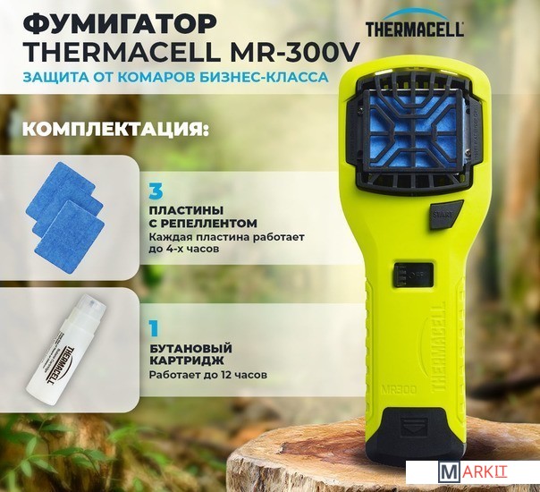 Противомоскитный прибор Thermacell MR-300 — это усовершенствованная модель из серии переносных фумигаторов, предназначенных для защиты от комаров и мошек во время активного отдыха.Работает по принципу фумигации, испаряя в воздух репеллент, который отпугивает насекомых на площади до 20 кв. м.Прибор не зависит от электричества! Пластина нагревается за счет газового бутанового картриджа. А сама пластина является запатентованной разработкой американских ученых-технологов. Она не выделяет запах и не дымит, делая Thermacell безвредным для детей и аллергиков. В комплект фумигатора входят 3 пластины и картридж, которые обеспечивают 12 часов бесперебойной работы.Thermacell MR-300 незаменим для людей, которые проводят время на дачах и в загородных домах, любят туристические походы, охоту и рыбалку, увлекаются путешествиями, ходят на пикники.Американское агентство по охране окружающей среды (ЕРА) высоко оценило качество, эффективность и безопасность Thermacell.Комплектация: Прибор, 1 газовый картридж, 3 пластины с репеллентом
