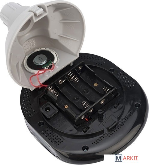 ИК-датчик движения с максимальной дистанцией 9 метров, угол обзора 90°.При срабатывании датчика отпугиватель имитирует звук лая собаки, выстрела из ружья или клич хищной птицы (в зависимости от выбранного вами режима). Также устройство отпугивает животных светом благодаря установленным на корпусе ярким диодам.