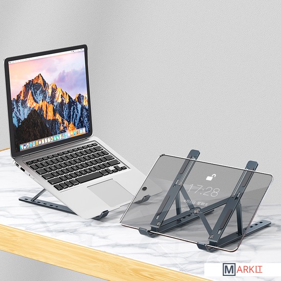 MAICONG N3 - это универсальная подставка под планшет или ноутбук с диагональю до 15,6 дюймов, произведенная из высококачественного алюминия, имеет прочную конструкцию, защищает с помощью силиконового покрытия, регулируется по ширине 4,5-18 см, поднимает на высоту от 6 до 15 см.