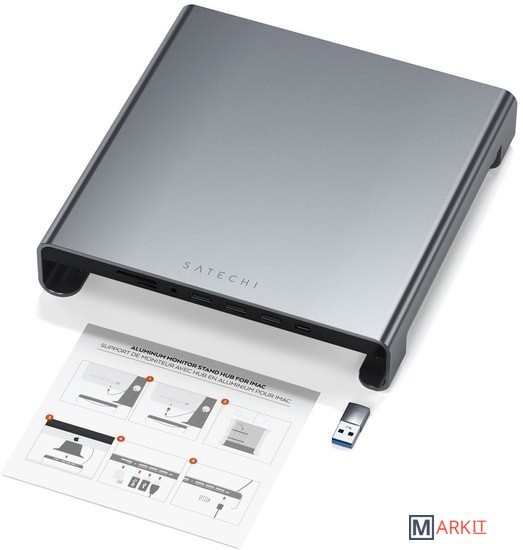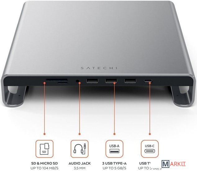 Просто подключите прилагаемый кабель Type-C к порту USB-C вашего компьютера и в вашем распоряжении будут 3 дополнительных порта USB 3.0, один порт USB-C, слоты для карт памяти micro SD и SD (UHS-I, up to 104 Mbp), а также аудиоразъем mini Jack 3,5 мм.Уникальный эргономичный дизайн подставки поднимает монитор до оптимальной высоты, для комфортной работы. Поднимая экран до уровня глаз, подставка Satechi помогает уменьшить напряжение шеи, а также способствует улучшению осанки при долой работе.