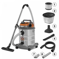 Устойчив к коррозии и механическим воздействиям.Благодаря стойкости к высоким температурам он отлично подходит для сбора золы и не остывших углей.Гибкий алюминиевый всасывающий шланг в полимерной оболочке не боится высоких температур и предназначен для сбора золы и неостывших углей.Удерживает крупные частицы пыли и золы в баке.Фильтр выполнен из огнеупорного материала, выдерживающего высокие температуры.HEPA+ (High Efficiency Particulate Air) – высокоэффективная система фильтрации воздуха состоит из 2-х частей: предварительный фильтр для удержания цементной пыли и HEPA фильтр, для удержания самых мелких частиц.Функция всасывания и откачки воды позволяет эффективно собирать жидкость с любого покрытия в объеме до 17 - 18 литров.Автоматическая остановка всасывания для предотвращения попадания жидкости в двигатель.Эффективно удаляет засоры в сливах раковин, ванн и душевых кабин, без необходимости разбора и применения химикатов.Специальная форма обеспечивает высокую степень разряжения и подходит для всех типов шлангов от 32 до 38 мм.Функция обратного выдувания 3000 л/мин позволяет очистить рабочее место от опилок и стружки, сдуть листву с дорожек или прочистить водосток или канализацию.Отверстие, расположенное в нижней части бака, облегчает слив собранной загрязненной жидкости без необходимости поднимать и переворачивать пылесос.Длина всасывающего шланга: 3 м.Диаметр всасывающего шланга: 32 мм.Производительность: 50 л/с.