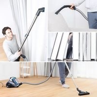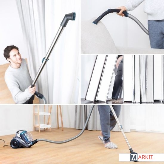 Двигатель мощностью 800 Вт и 23000 об / мин, сила всасывания - 17kPa.Технология мультициклона обеспечивает постоянную высокую мощность всасывания до полного заполнения резервуара. Каждый циклон имеет 2 воздухозаборника, которые создают высокую центробежную силу.Гибкий шланг из этиленвинилацетата.Входной HEPA-фильтр эффективно задерживает очень мелкие частицы и обеспечивает чистый отработанный воздух.Благодаря большой заслонке вы можете легко опорожнить пылесборник, открыв его над мусорным ведром с помощью одной кнопки. Все части пылесборника можно мыть водой, но перед сборкой их следует тщательно высушить.Круглую щетку можно вращать и регулировать. ВСТРОЕННЫЙ ДЕРЖАТЕЛЬ ДЛЯ ПРИНАДЛЕЖНОСТЕЙ. Крепится непосредственно к телескопической трубе, что позволяет держать самые маленькие аксессуары всегда под рукой.