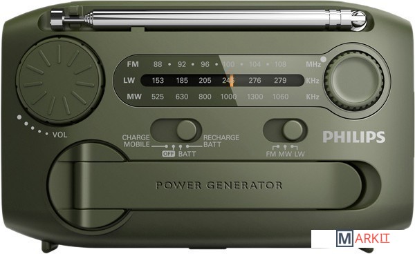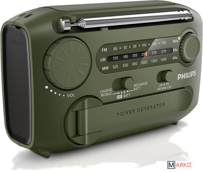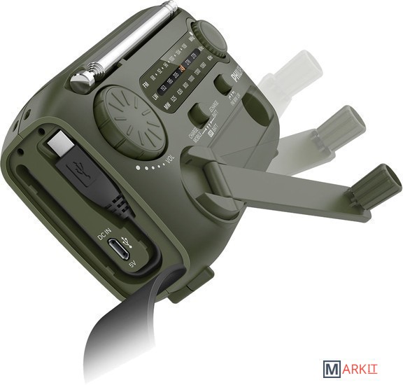 Портативный радиоприемник AE1125/12 создан для использования вне дома. Он оснащен кинетическим зарядным устройством, поэтому элементы питания не требуются. Радио оснащено встроенной сиреной для привлечения внимания и зарядным устройством USB для зарядки и подключения.