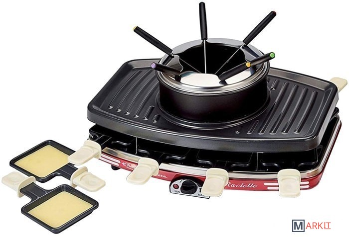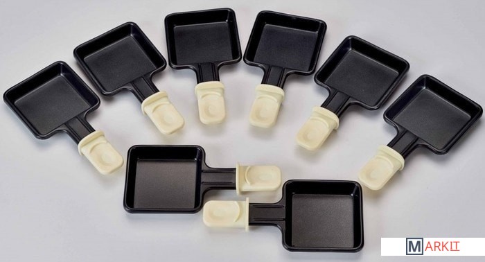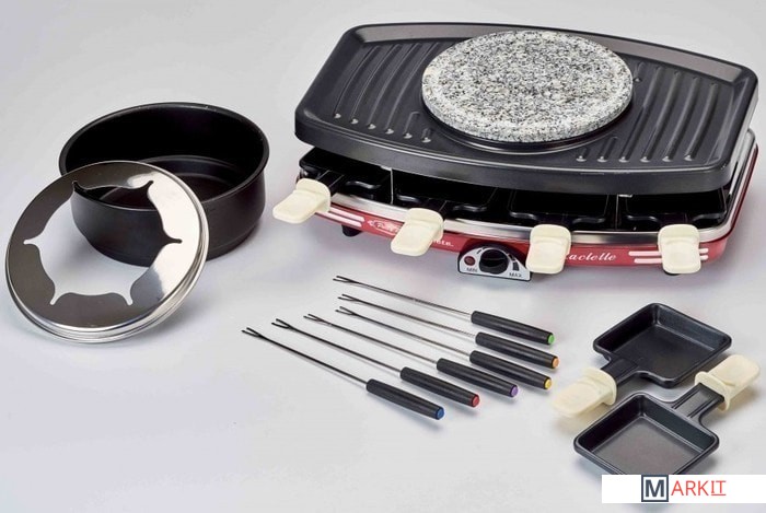 | Комплектация | - 8 противней для раклета; - 6 вилок для фондю; - емкость для фондю. |