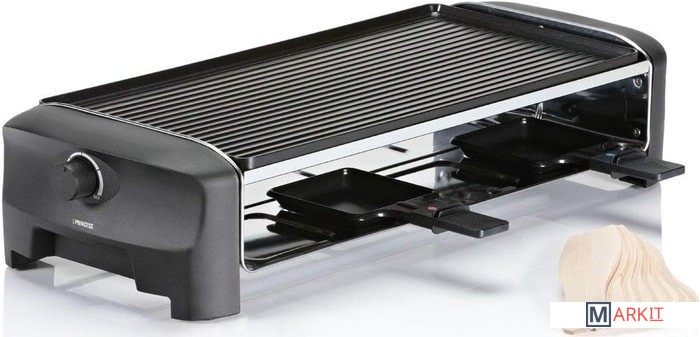 | Комплектация | - съемная двухсторонняя панель- 8 противней для раклета- 8 деревянных лопаток |