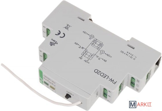 Двухканальный диммер-реле, для LED ламп и LED лент, soft start, локальное и удаленное управление, до 8 радио передатчиков, монтаж на DIN-рейкуМодуль FW-LED2D предназначен для дистанционного управления по радиоканалу (включить/выключить, диммировать) светодиодными лампами и лентами LED с питанием 12 В.- двухканальный модуль;- возможность управления модулем с 8-ми пультов;- местное управление – возможно управлять модулем непосредственно подключенными к его входам моностабильными выключателями (без фиксации);- «Soft start» – плавное изменение яркости при включении и выключении;- ретрансляция сигналов управления – позволяет увеличить дальность радиосвязи;- встроенная электронная тепловая защита – предохраняет устройство от повреждения в случае перегрузки.Дистанционное управление модулем FW-LED2D осуществляется при помощи следующих передатчиков и пультов F&Wave:- FW-RC10 и FW-RC4 – 10 и 4-канальные пульты дистанционного управления;- FW-WSO2 – 2-клавишные выключатели для дистанционного управления (напряжение питания от аккумулятора 3В DC, монтаж на плоскость);- FW-RC5 – 5-канальный передатчик по радиоканалу (напряжение питания от аккумулятора 3В DC, с входами местного управления и отдельными входами ON (сценарий «Вкл. ВСЕ») и OFF (сценарий «Выкл. ВСЕ»);- FW-RC4AC – 4-канальный передатчик по радиоканалу (напряжение питания 230 В АС, с входами местного управления и возможность изменения конфигурации входов S1 и S2 на функцию ON (сценарий «Вкл. ВСЕ») и (или) OFF (сценарий «Выкл. ВСЕ»);- FW-GS-W/B - 4 канальный передатчик по радиоканалу, сенсорный, материал - стекло, исполнение черное и белое.ВНИМАНИЕ!Управляющий вход не работает с выключателями с подсветкой! Передатчики и пульты F&Wave работают c модулем по принципу бистабильного реле: одно кратковременное нажатие кнопки пульта или передатчика включает нагрузку, второе нажатие выключает нагрузку, длительное нажатие (более 1 секунды) увеличивает или уменьшает уровень яркости с шагом 10%.Передатчики FW-RC5 и FW-RC4AC имеют дополнительные входы ON (Сценарий «Вкл. ВСЕ») и OFF (Сценарий «Выкл. ВСЕ»).Учитывая характер передачи и ретрансляции сигнала, не следует использовать одни и те же кнопки на передатчике чаще чем через 2 секунды. Переключение модуля может происходить с небольшим опозданием.Не рекомендуется применение передатчиков FW-RC4 и FW-RC10 для управления группой приемников, т.к. необходимо учитывать возможность нарушения синхронизации включения (особенно при работе на больших расстояниях) или их одновременное использование с местными выключателями.