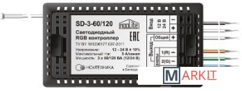 Система nooLite – это технология умного дома, которая позволяет управлять электроприборами по радиоканалу (частота 433,92 МГц).Силовой блок – это устройство, которое подключается к нагрузке (например, к светильнику) и управляет им, получая по радиоканалу команды, поэтому для его эксплуатации необходимо управляющее устройство nooLite (пульт, датчик движения, датчик температуры/влажности, Ethernet-шлюз и т.п.).Радиоуправляемый светодиодный RGB контроллер (силовой блок) nooLite SD-3-60/120 предназначен для управления светодиодной лентой на напряжение 12/24В. Он имеет два режима работы:- Режим 1. Управление одноцветной светодиодной лентой, 3 канала (установлен по умолчанию).- Режим 2. Управление трехцветной RGB светодиодной лентой, 1 канал.