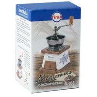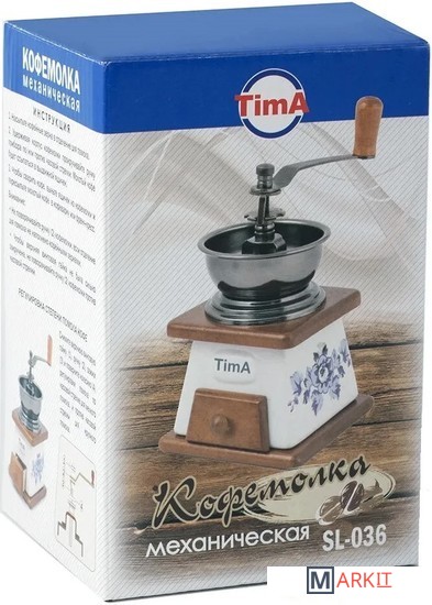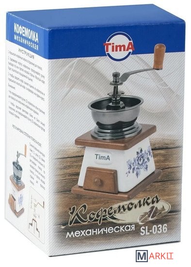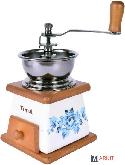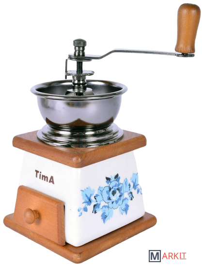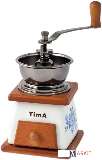 В ручной кофемолке TimA размол кофейных зерен производится керамическими жерновами, приводимыми во вращение рукояткой. Использование керамических материалов не только сохраняет натуральный вкус и аромат кофе, но и позволяет значительно продлить срок службы кофемолки. Порция кофейных зерен засыпается в чашу либо в купол.Степень измельчения кофейных зерен можно регулировать самостоятельно. Чтобы изменить степень помола покрутите винт на центральном стержне над жерновами. Для варки кофе в турке расположите жернова максимально близко друг к другу, для заваривания кофе во френч-прессе увеличьте расстояние между жерновами. Молотый кофе накапливается в специальном деревянном ящичке внизу корпуса.