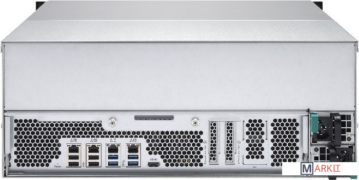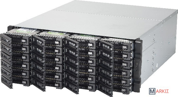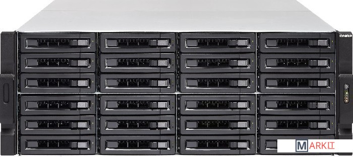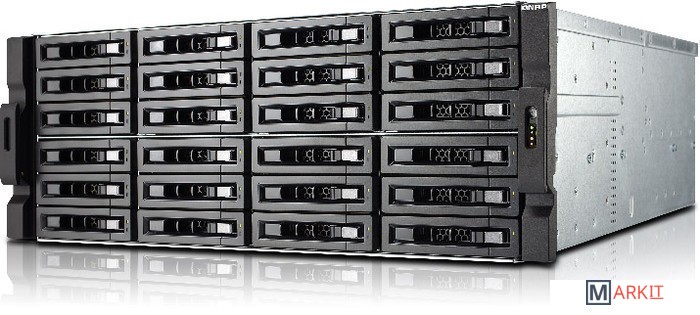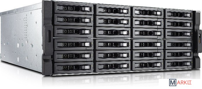 Сетевой RAID-накопитель, 24 отсека для HDD, ECC-память, стоечное исполнение, два блока питания.