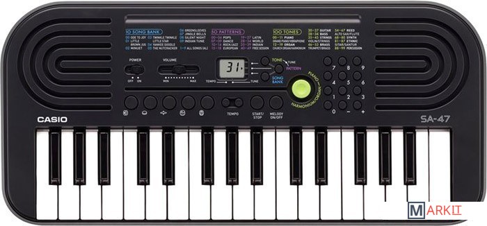 Модели SA-46 и SA-47, несмотря на малый размер и всего лишь 32 клавиши, это не просто игрушки, а полноценные музыкальные инструменты для начинающих. Во-первых, в них присутствуют солидная 8-ми нотная полифония и прекрасное звучание всех 100 встроенных тембров и 50 стилей. А во-вторых, мини клавиатура этих синтезаторов отлично подходит для детских пальчиков. Также в моделях есть LC дисплей, вынесенные на корпус кнопки ударных инструментов и специальная кнопка для быстрого переключения между фортепьяно и органом (SA-46) и между фортепьяно и язычковым органом (SA-47) Обе модели имеют дизайн в стиле ретро, отличаясь между собой цветовой палитрой – SA-46 в ярко зеленом , а SA-47 в серебристом корпусах.