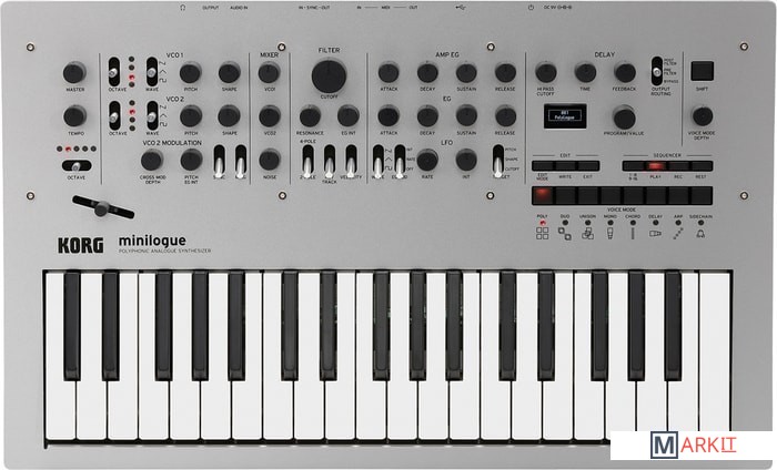 KORG Minilogue - это полностью программируемый, 4-голосный полифонический синтезатор, также оснащённый встроенными эффектами задержки и реверберации. Синтезатор имеет уникальный аналоговый движок, быстрый доступ к 100 заводским 100 пользовательским пресетам, 8 голосовых режимов для создания своей конфигурации из 4 голосов - унисон, полифония и пр. На передней панели расположен 41 регулятор для настройки параметров и быстрого изменения функций, осциллограф в режиме реального времени дающий визуальный контроль звука, 16-шаговый полифонический секвенсер с автоматизацией вплоть до 4 параметров синтезатора и многое другое.